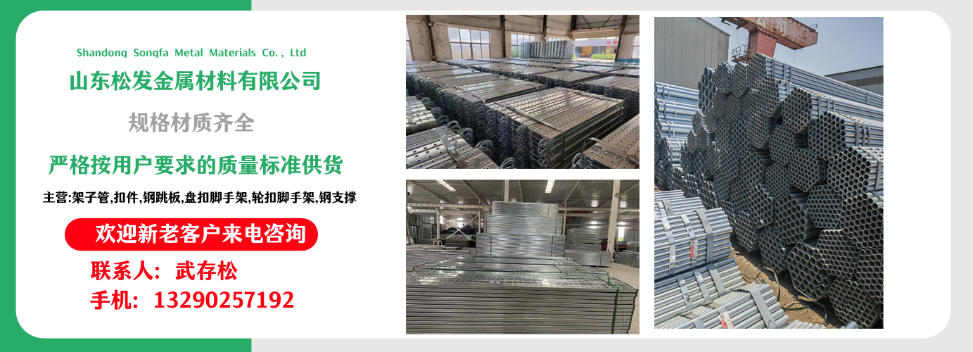 山東松發金屬材料有限公司主營架子管,扣件,鋼跳板,盤扣腳手架,輪扣腳手架,鋼支撐生產廠家。本廠專業生產銷售?! 〗ㄖ眉茏庸堋?主要用于房建,橋梁,鐵路,公路,地鐵,水庫,隧道,支撐。 架子管,扣件,鋼跳板,盤扣腳手架,輪扣腳手架,鋼支撐的優越性及應用“ ”產品因具有結構簡單合理、設計巧妙、使用方便、安全、快捷、易于運輸、儲存、維護簡單等特點。 公司一貫堅持“質量,用戶至上,優質服務,信守合同”的宗旨,憑借著高質量的產品,良好的信譽,優質的服務,產品暢銷全球。歡迎廣大客戶來電洽談,共同發展,共創輝煌! 山東松發金屬材料有限公司秉承誠信服務、恪守信譽的宗旨,在同等的質量下,保證以最低的價格,最完善的服務,最高的信譽來答謝各界朋友的支持和厚愛,歡迎您的來電、咨詢,我們將竭誠為您服務!...